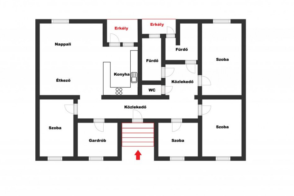 - elosztása: konyha + nappali + étkező, 5 szoba, 1 fürdő +WC, 1 fürdő, 1 WC, közlekedő, 2 erkély