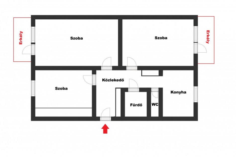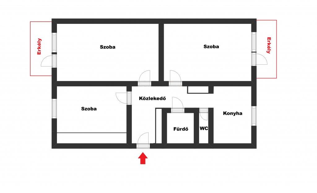 - elosztása: 3 szoba, konyha + étkező, fürdő, WC, közlekedő, 2 erkély