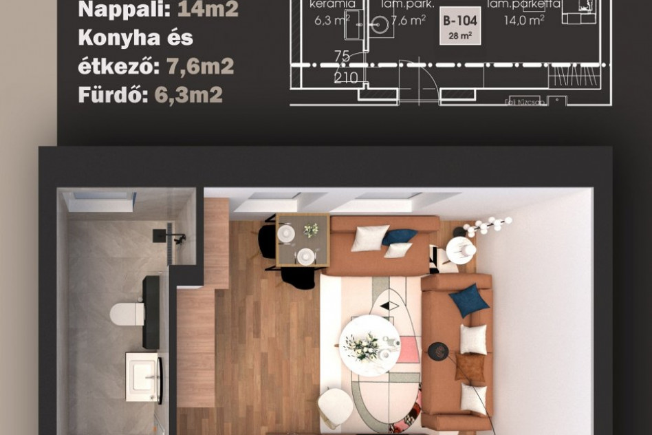 - konyha + szoba, fürdő + WC elrendezésű