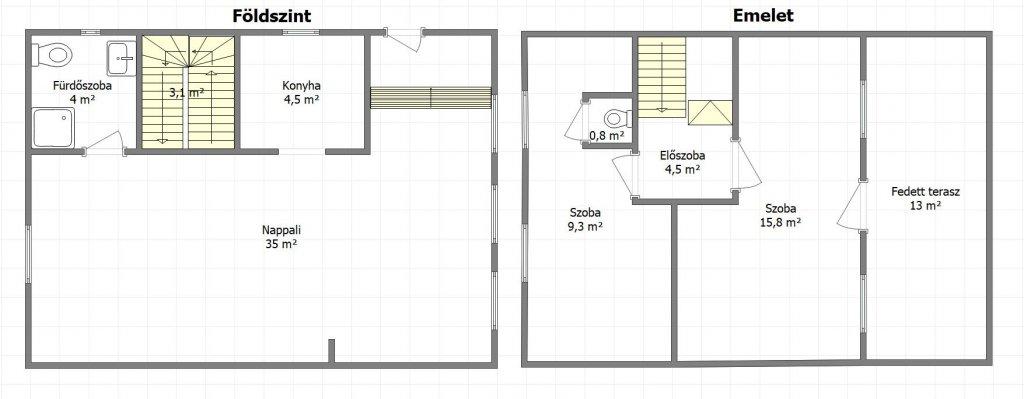 - kétszintes 76 m2-es nyaraló 13 m2-es fedett terasszal;