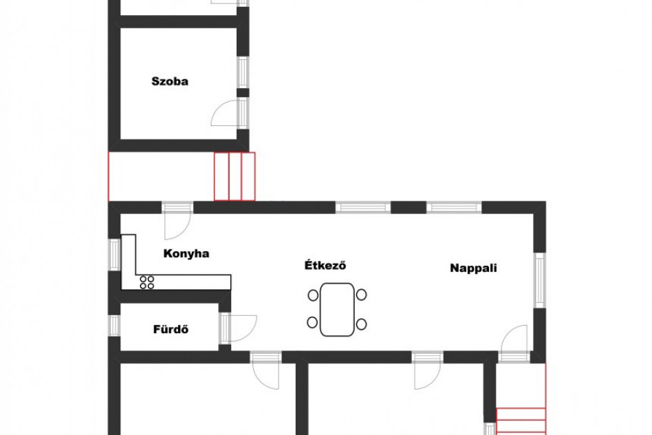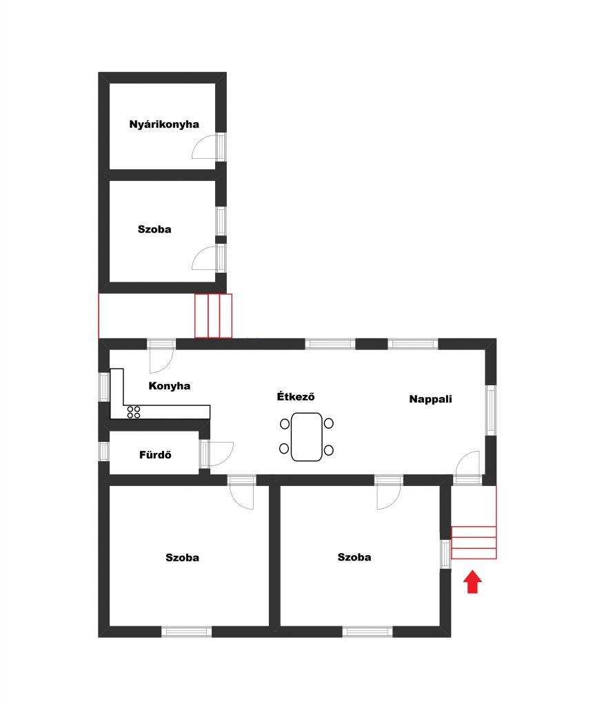 - nappali + konyha + étkező, 2 szoba, fürdő + WC elrendezésű