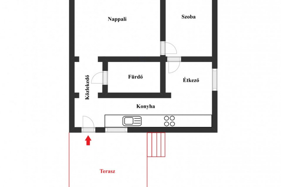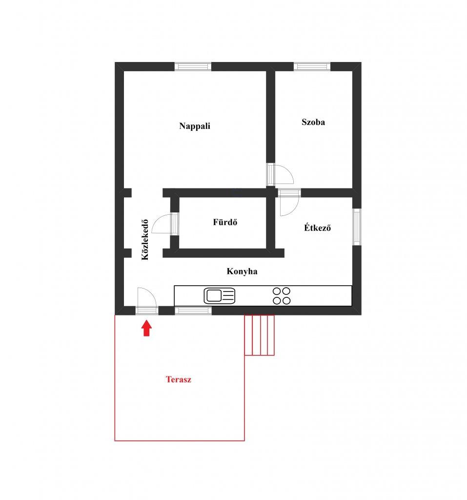- 1 szoba, fürdő + WC, konyha + étkező + nappali, előszoba és terasz elrendezésű