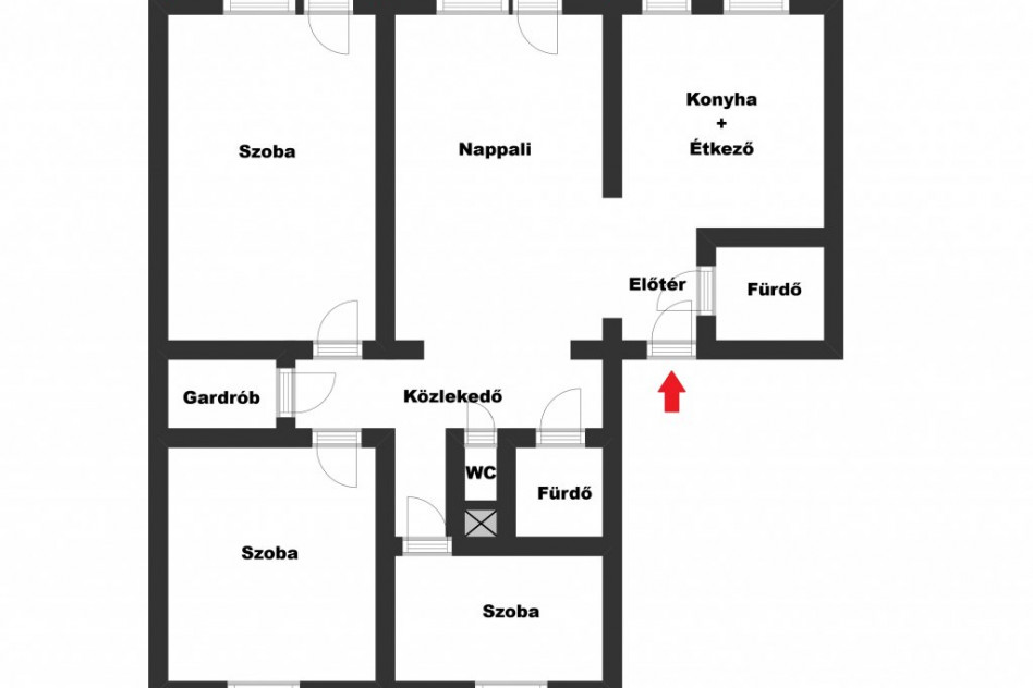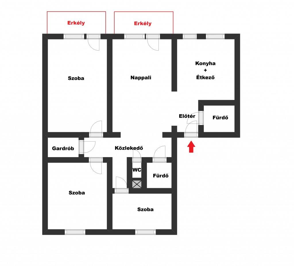 - elrendezése: 3 szoba + nappali, gardrób, konyha + étkező, közlekedő, 1 fürdő WC-vel, 1 fürdő külön WC-vel, 2 erkély