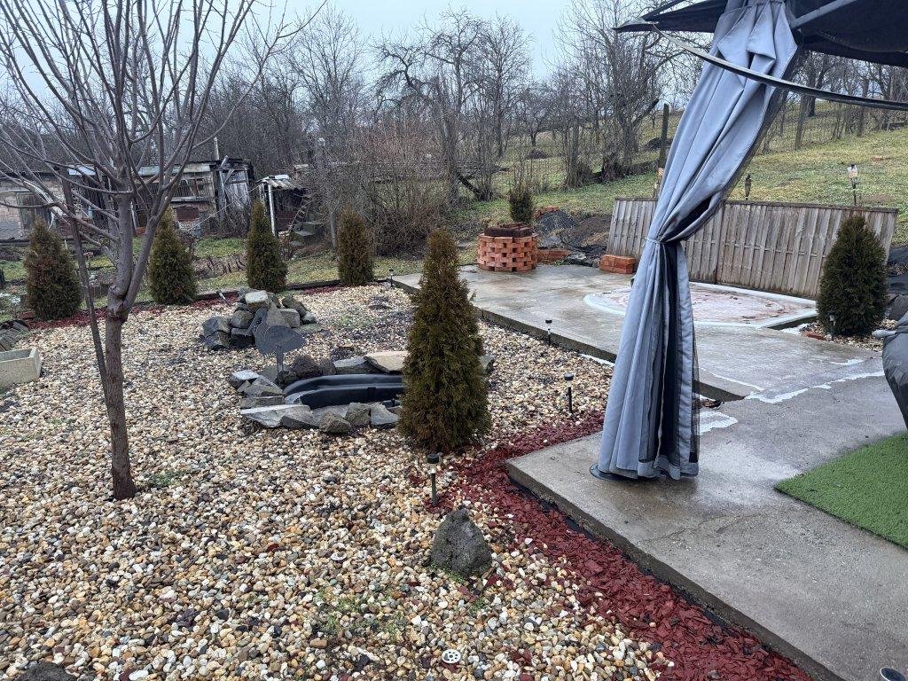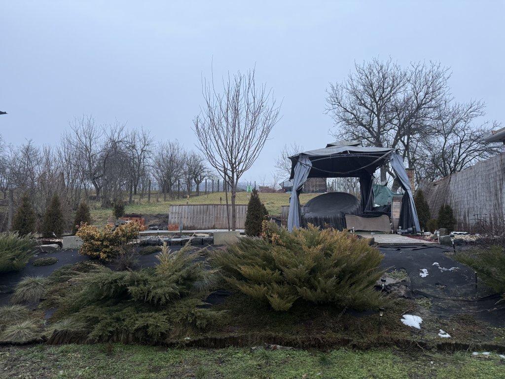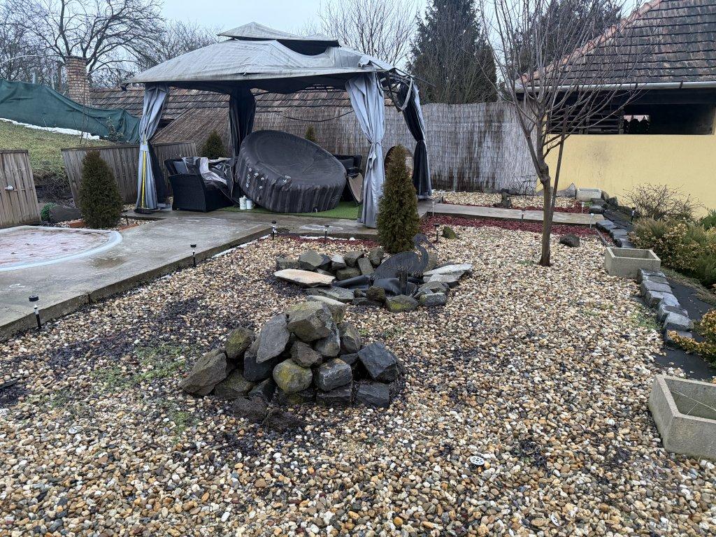 A lakóházhoz 2418 m2-es körbekerített telek tartozik, melynek egy része parkosított illetve viacolor burkolattal ellátott. Itt került elhelyezésre a kerti sütő valamint a jacuzzi.