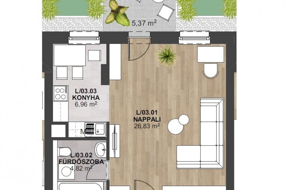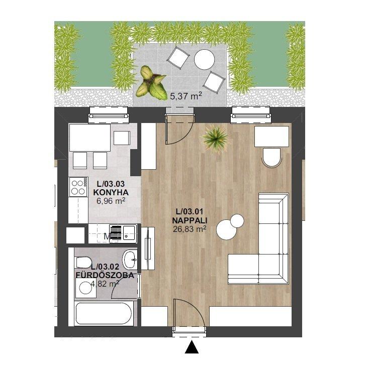 Hirdetésben szereplő stúdió lakás 38,61 nm alapterületű, melyhez 5,37 nm terasz tartozik, 1. emeleten található és déli tájolású. Részletes helyiség lista és elrendezése az alaprajzon megtekinthető.