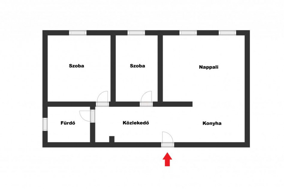 - 2 külön nyíló szoba, fürdő + WC, konyha + étkező + nappali és előszoba elrendezésű