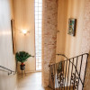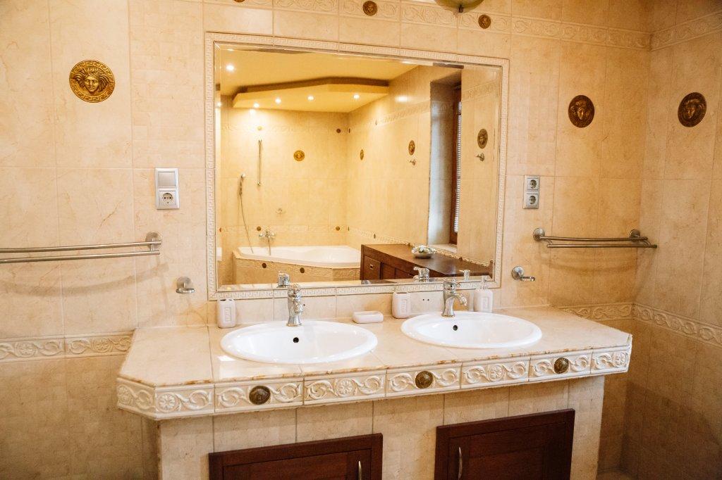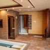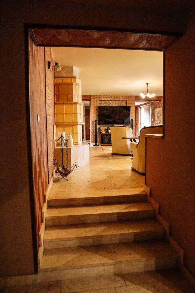 A főépület belső, kétszintes lakótere önállóan 330 m2. Az első szinten, egy légtérben található a nagy nappali és konyha az étkezővel, teraszkapcsolattal, valamint innen nyílik a dolgozószoba, szemben vele egy tágas fürdőszoba. Tovább lépve csekély szintkülönbséggel érhető el a wellness-részleg, ugyancsak teraszkapcsolattal.