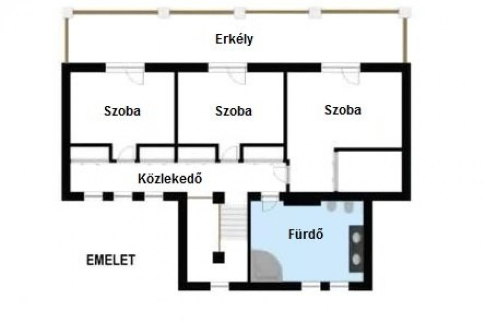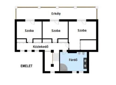Az emeleten van három szoba, fürdőszoba, beépített szekrények. Minden szoba D-DK-i tájolású, és minden szobából kiléphetünk a 30 m2-es fedett erkélyre.