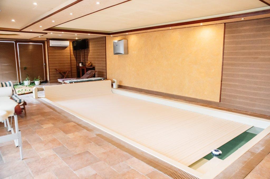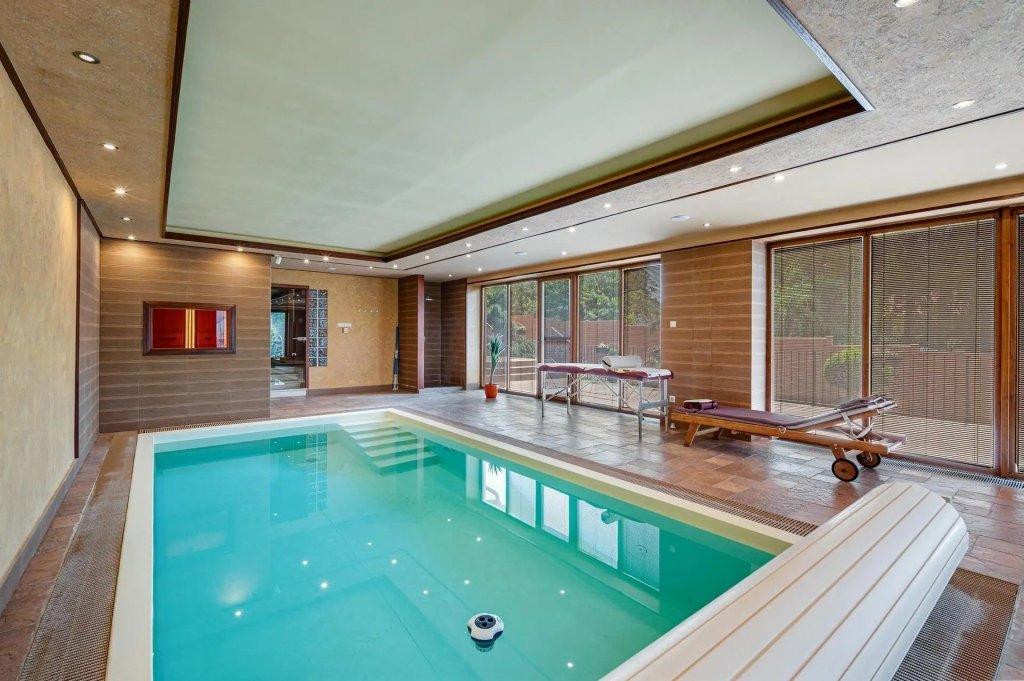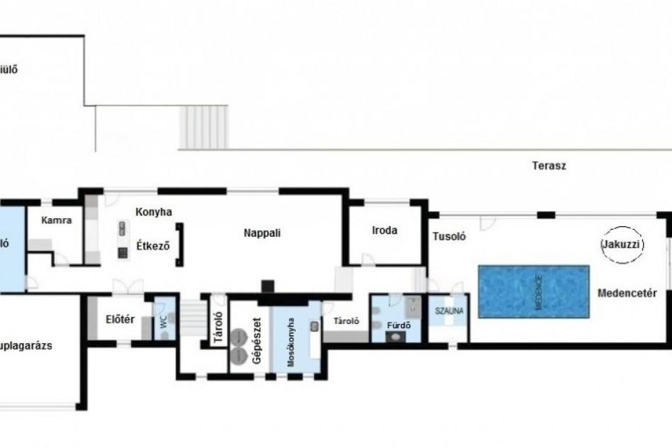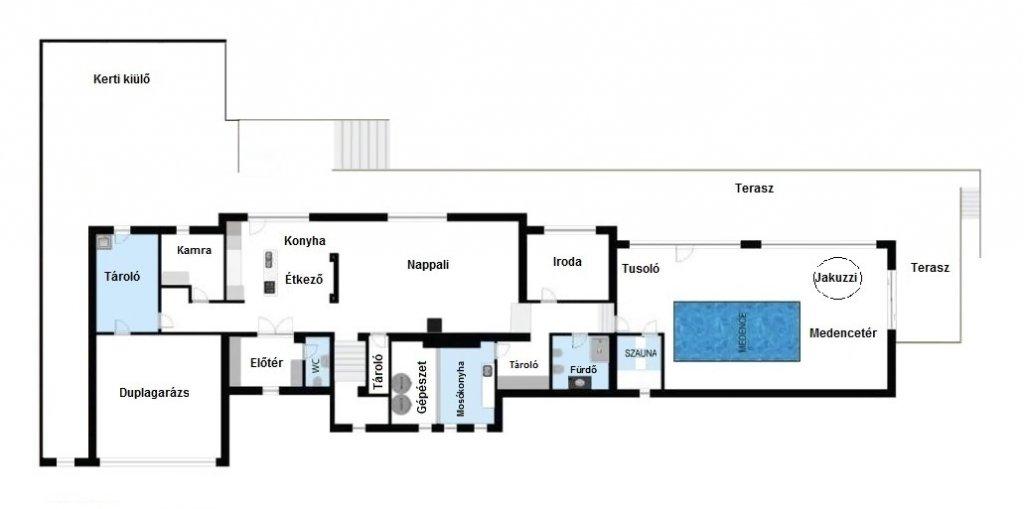 - Extrák: belsőépítész által tervezett enteriőr, belső, feszített víztükrű, fűthető medence, nagy teljesítményű párátlanító, süllyesztett jakuzzi, szauna, külön mosókonyha, vendégmosdó, minden helyiség légkondicionált. Az alsó szinten kialakított, teljesen felszerelt konditerem.