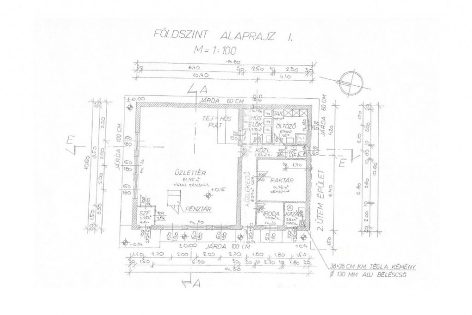 - elosztása: üzlettér, szélfogó, húselőkészítő, raktár, öltöző, WC, iroda, kazánház, közlekedő